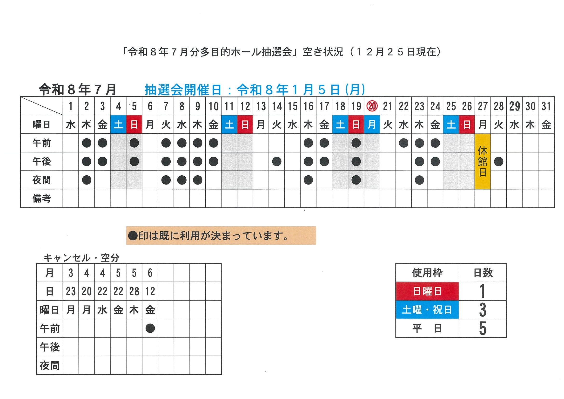 「令和8年7月分 多目的ホール抽選会」空き状況(12月25日現在)