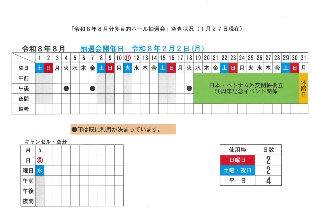 「令和8年8月分 多目的ホール抽選会」空き状況(1月27日現在)