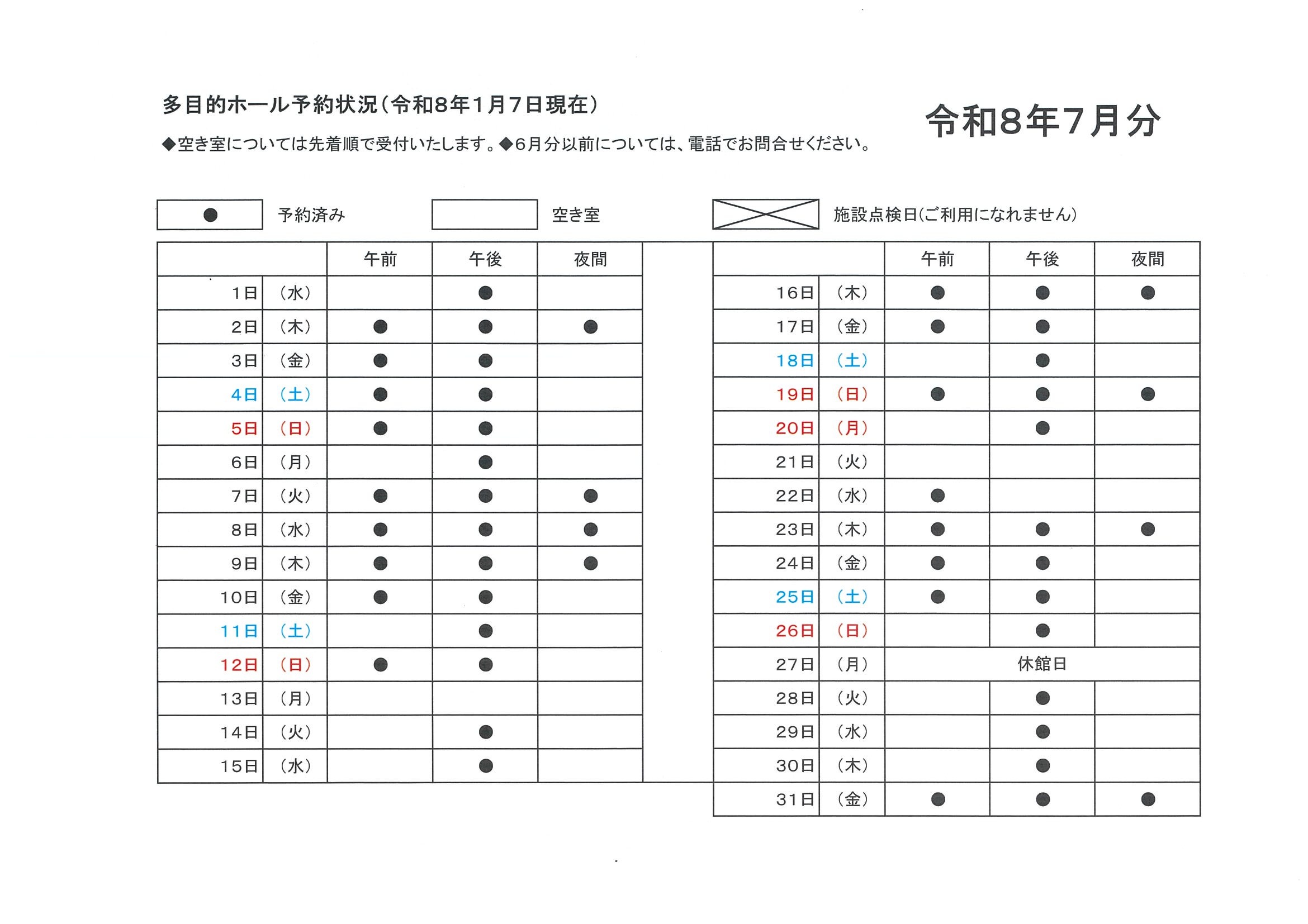 多目的ホール予約状況 1月7日現在