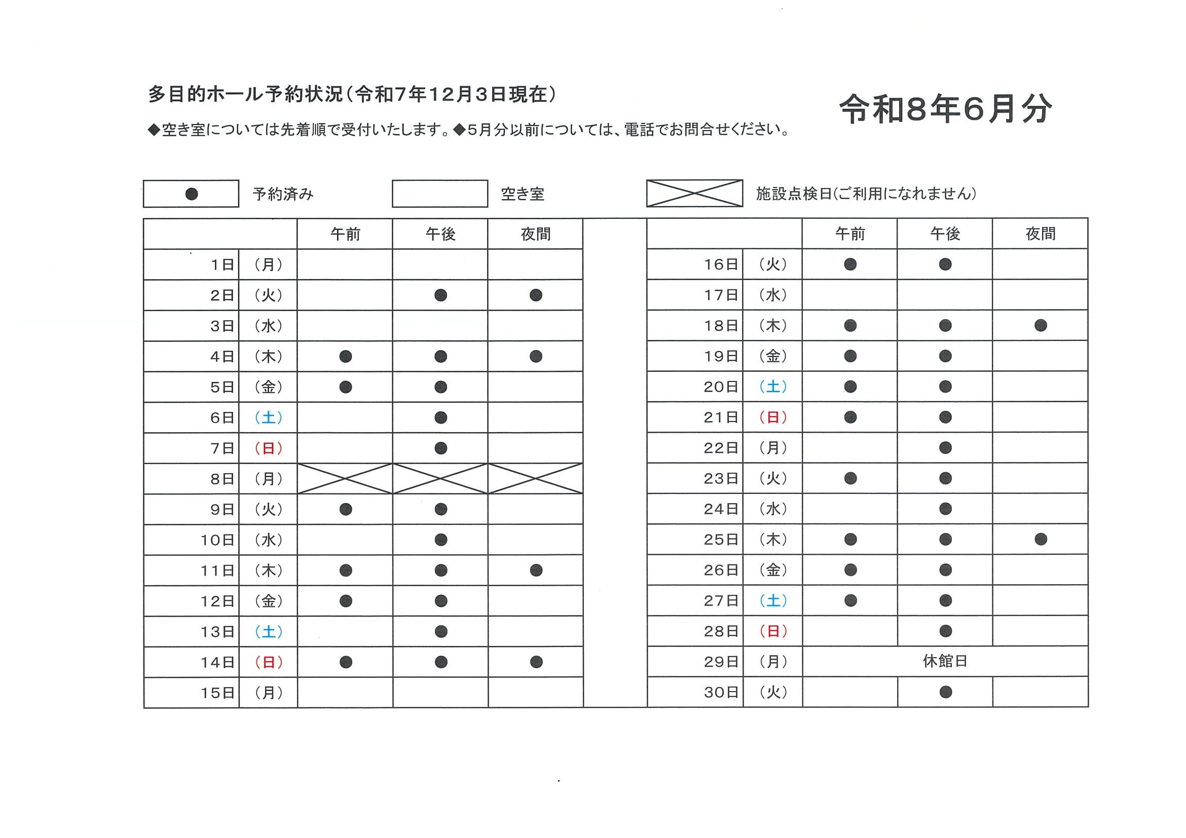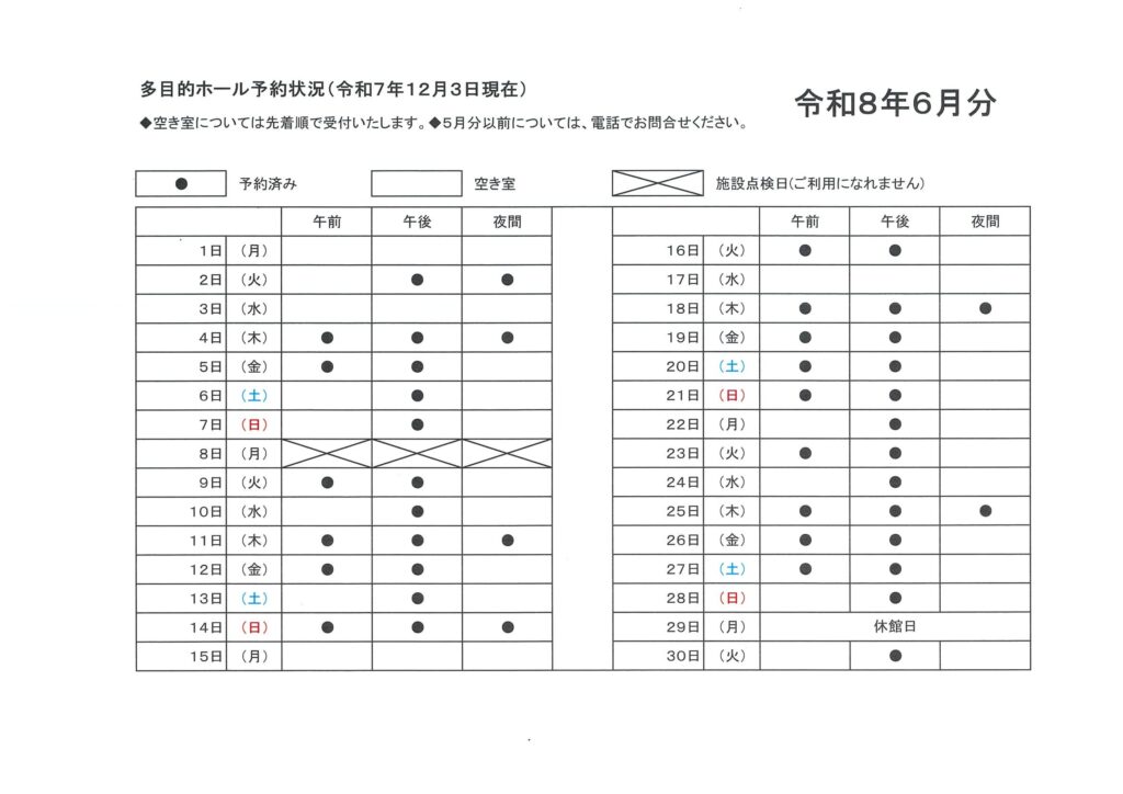 多目的ホール予約状況 12月3日現在